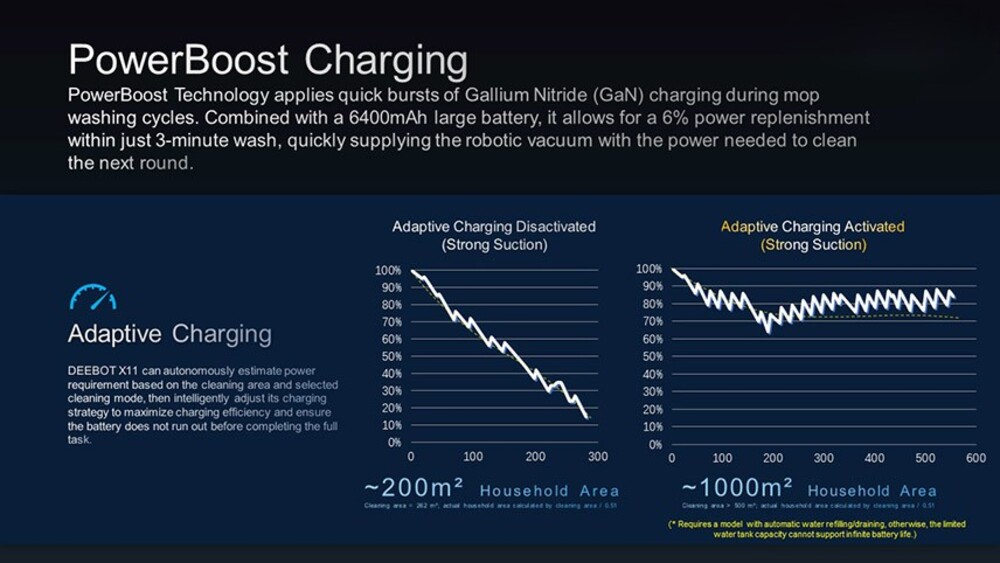 Ngoài ra, PowerBoost còn hỗ trợ sạc thích ứng, tự động tính toán nhu cầu năng lượng dựa trên diện tích và chế độ làm sạch, từ đó điều chỉnh chiến lược sạc hợp lý và an toàn hơn.
