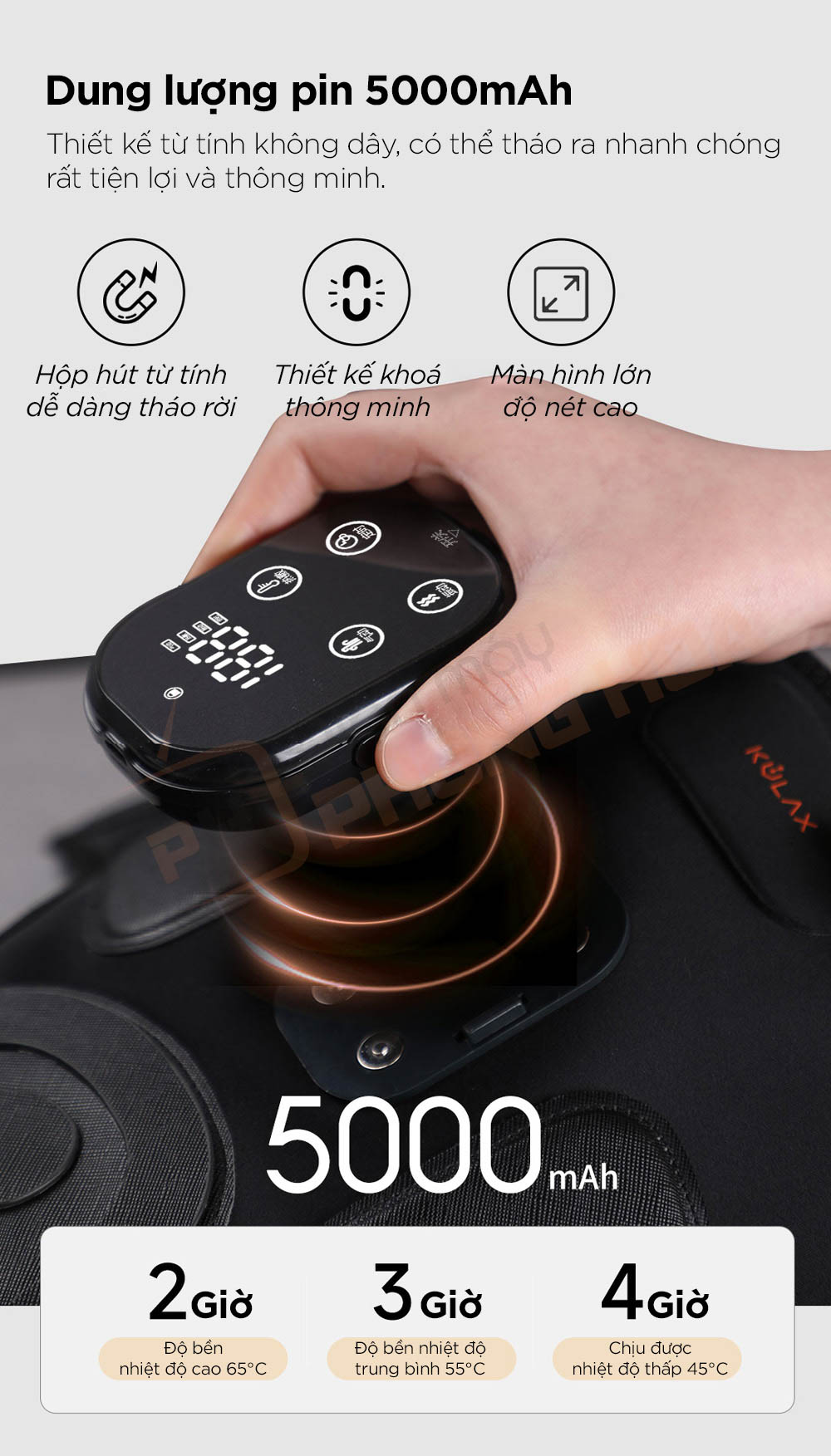 Đai massage khớp gối KULAX mang đến trải nghiệm thư giãn tối ưu với 3 chế độ massage chuyên sâu và tính năng chườm ấm nhiệt giúp giảm nhanh cảm giác đau nhức, mỏi mệt. Với viên pin dung lượng 5000mAh, sản phẩm đảm bảo thời gian sử dụng lâu dài, đồng hành cùng bạn chăm sóc và bảo vệ khớp gối mọi lúc mọi nơi.