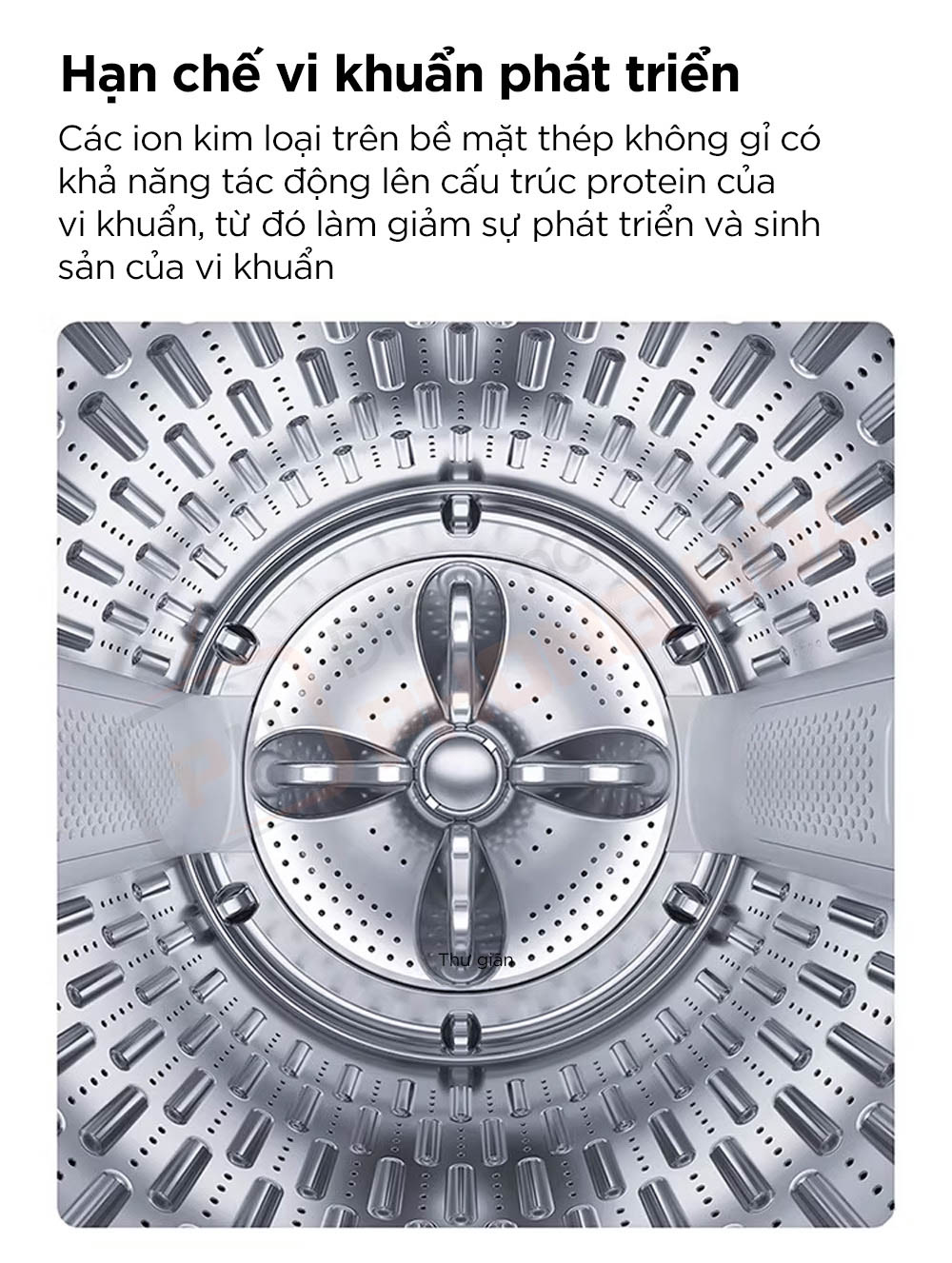 - Lồng giặt thép không gỉ tích hợp ion kim loại giúp hạn chế vi khuẩn sinh sôi và phát triển.