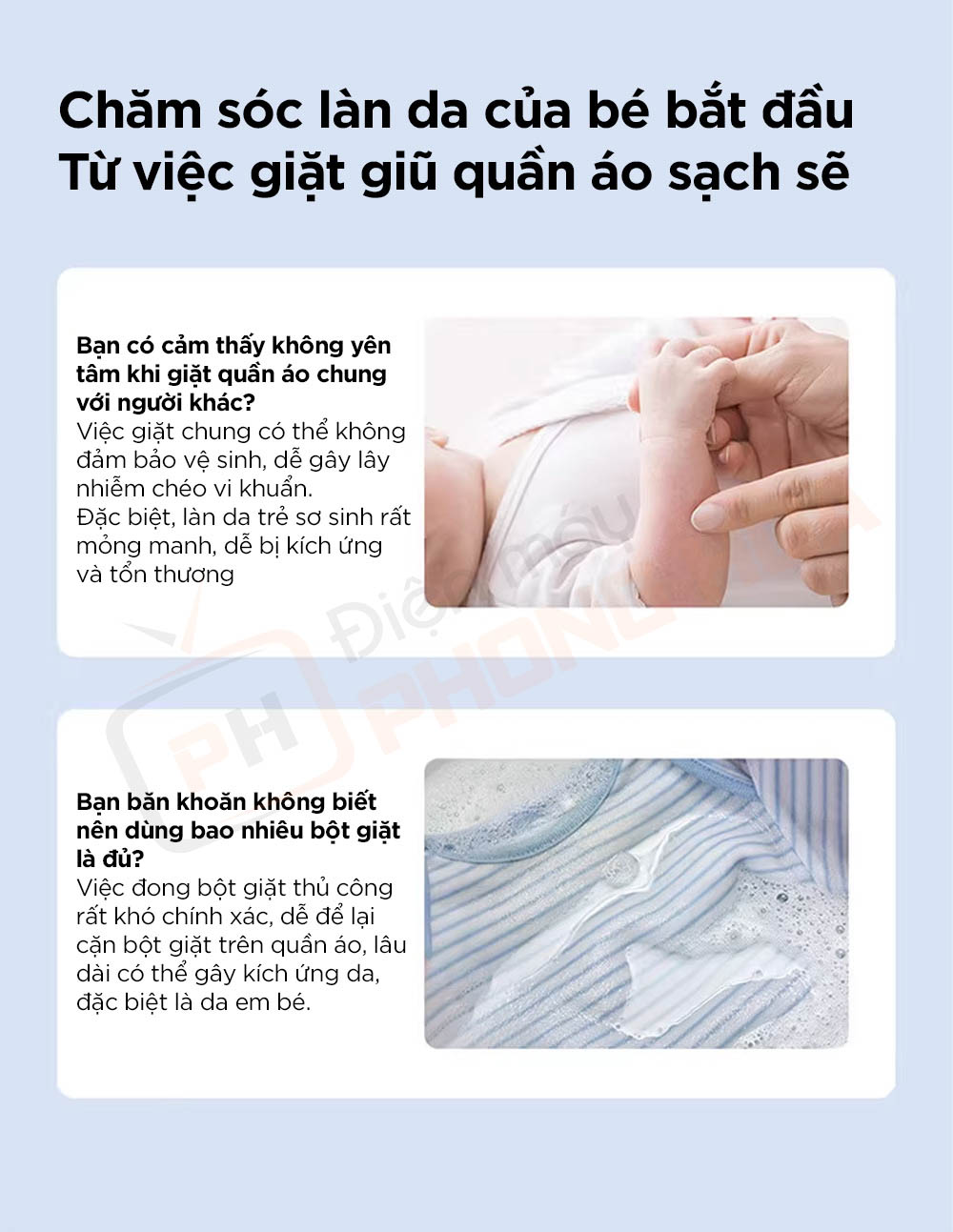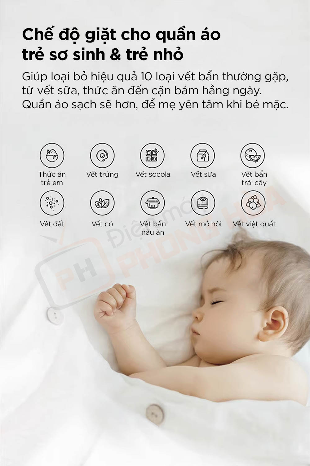 - Chế độ giặt chuyên biệt cho quần áo trẻ sơ sinh và trẻ nhỏ giúp loại bỏ hiệu quả 10 loại vết bẩn thường gặp.
