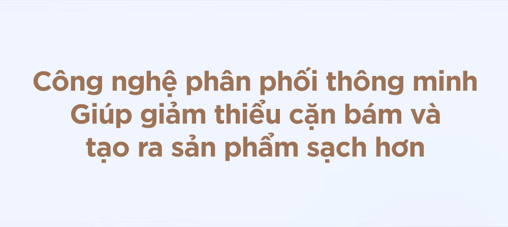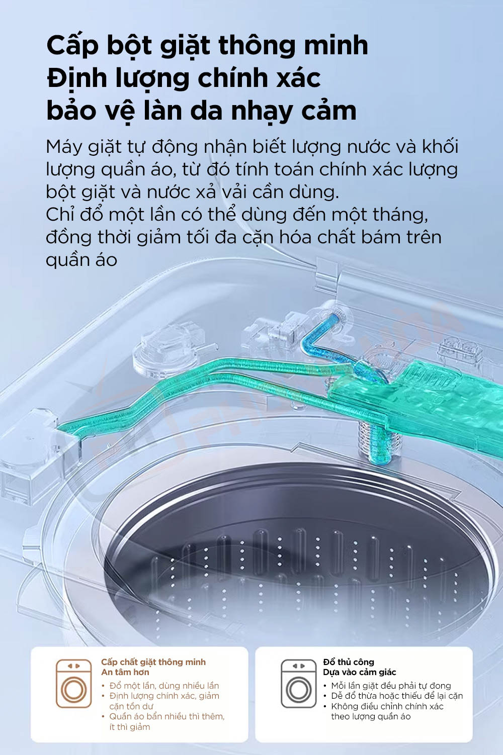 - Công nghệ phân phối chất giặt thông minh giúp tính toán chính xác lượng sử dụng, hạn chế dư thừa và giảm cặn bám trên quần áo.