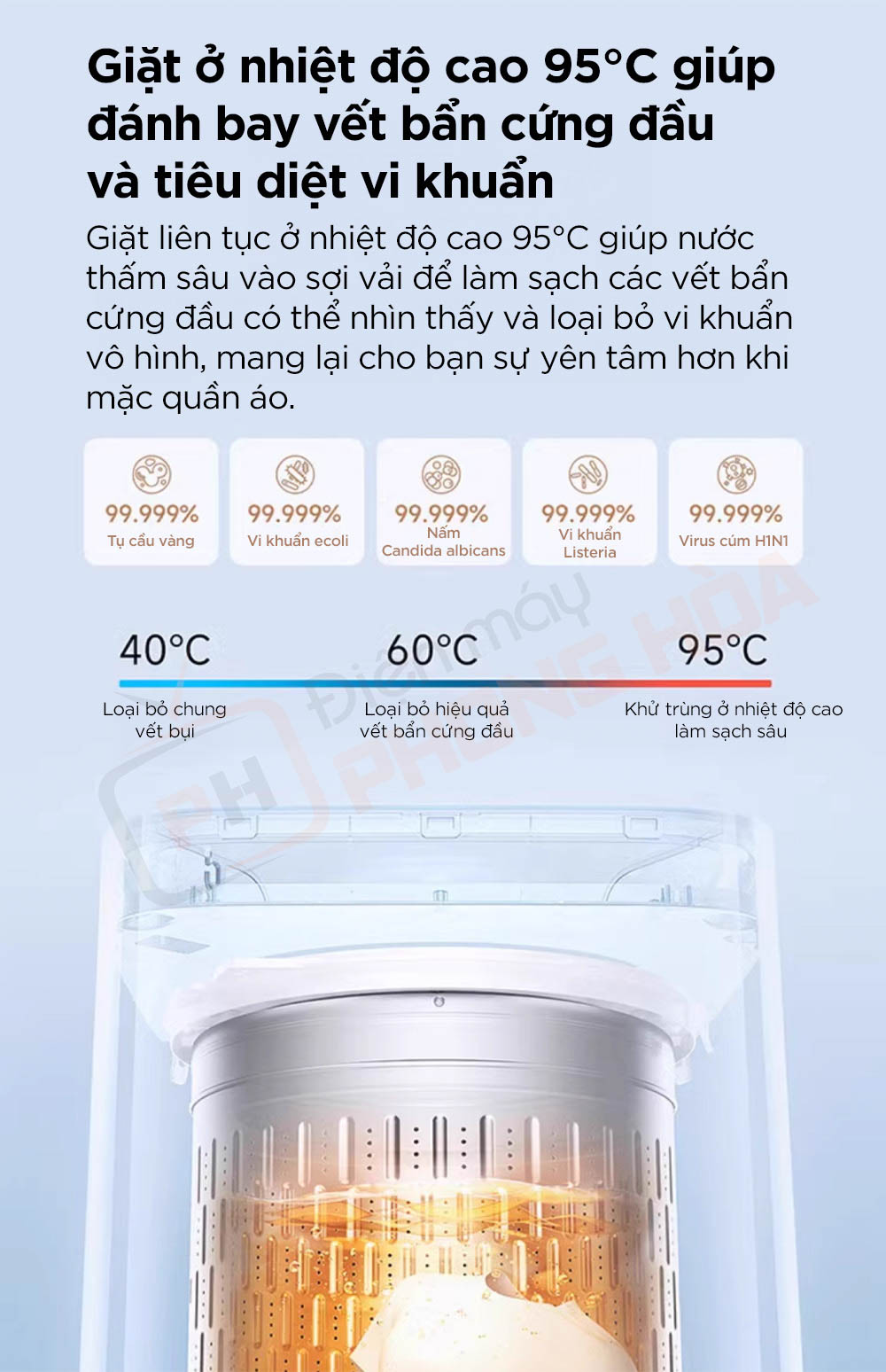 - Chế độ giặt nước nóng lên đến 95°C cho khả năng khử trùng tới 99,999%, loại bỏ hiệu quả các vi khuẩn và virus thường gặp.