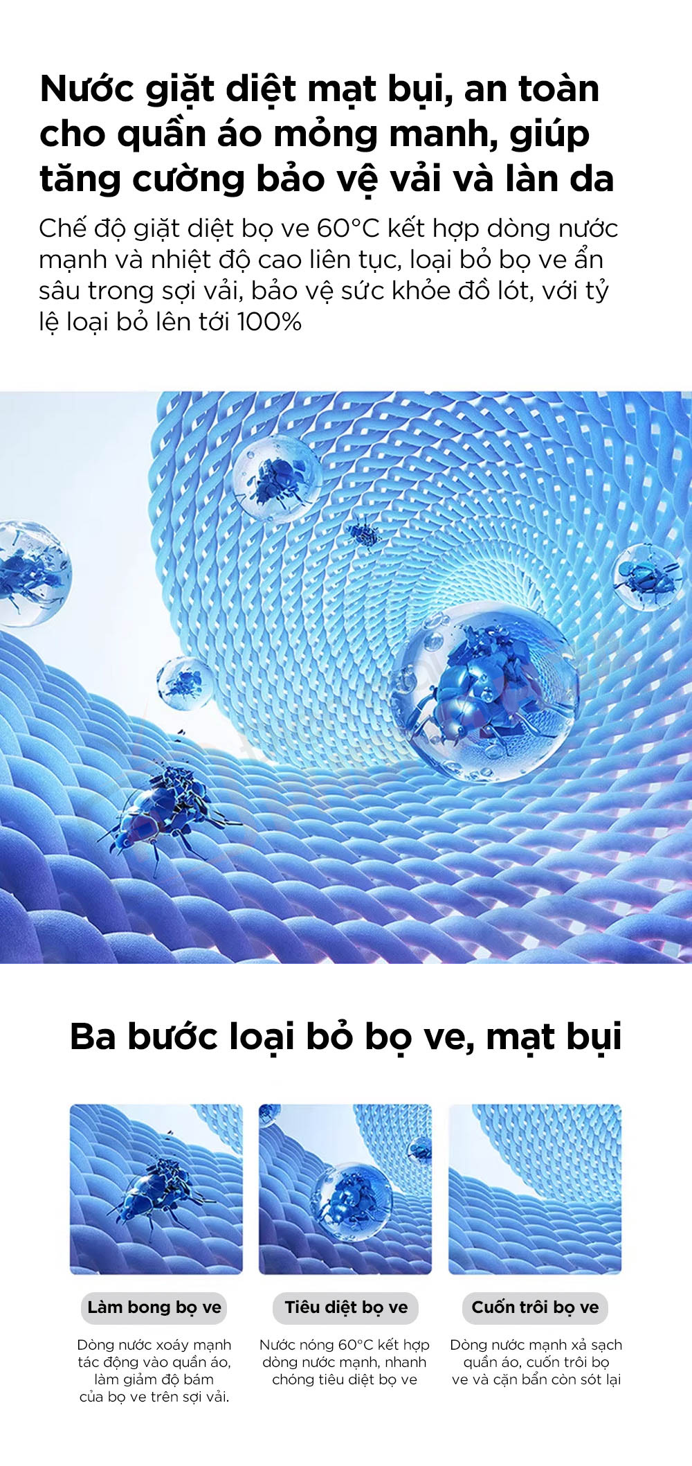 - Chế độ giặt diệt bọ ve 60°C kết hợp dòng nước mạnh giúp loại bỏ bọ ve và mạt bụi với hiệu quả lên đến 100%.