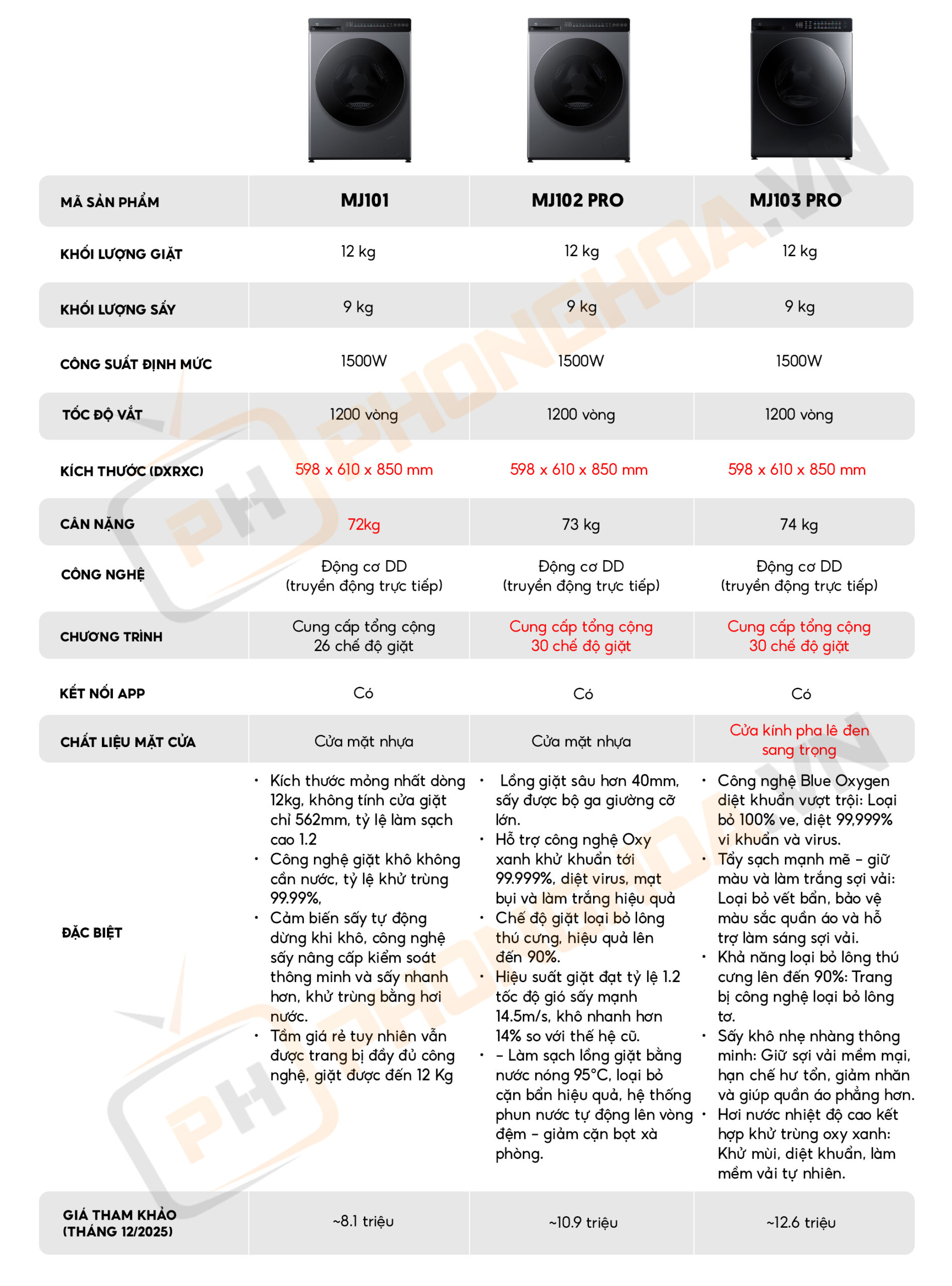 Bảng so sánh 3 máy giặt 12kg sấy 9kg tại Phong Hòa
