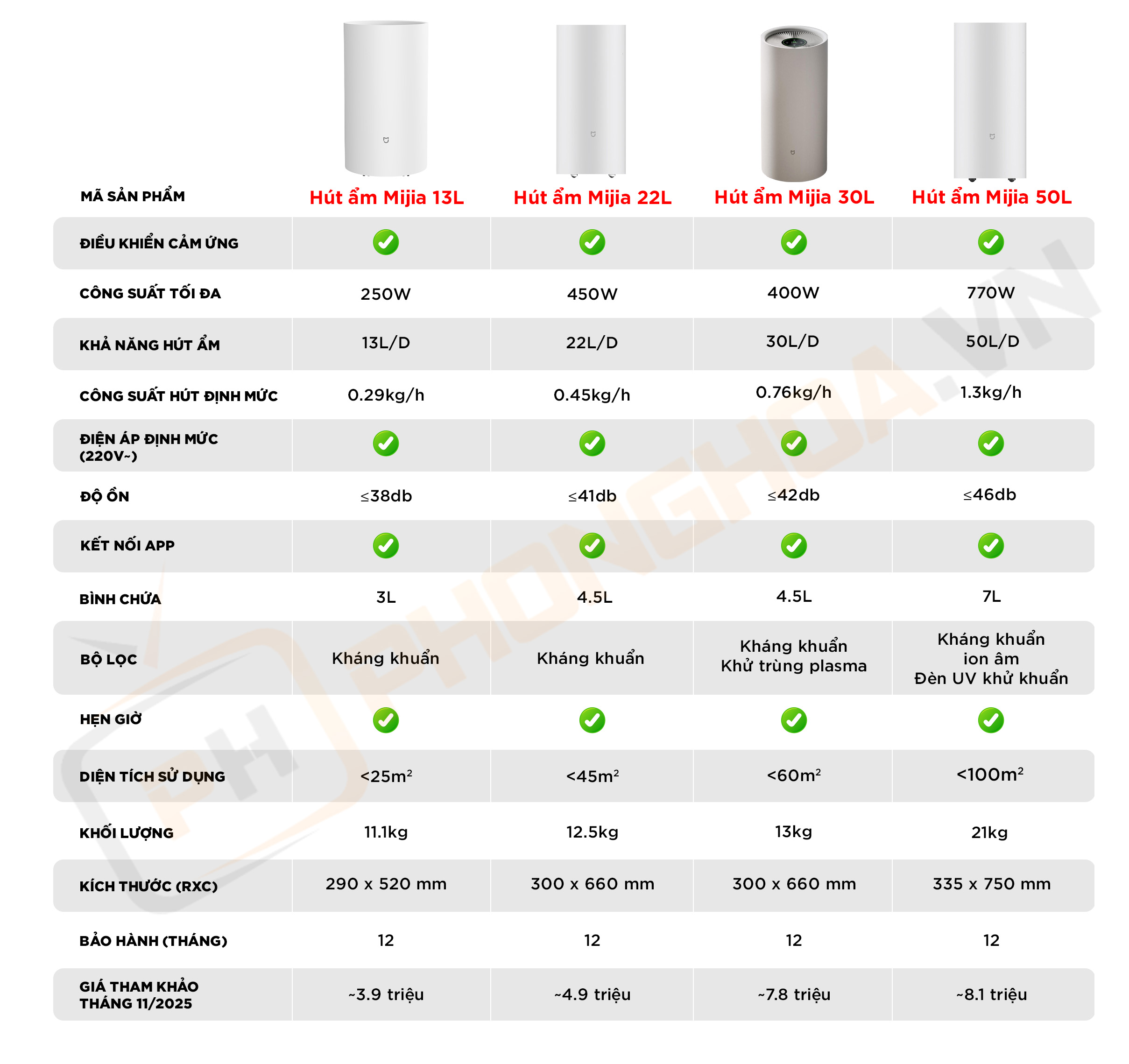 Bảng so sánh giữa các dòng máy hút ẩm Xiaomi Mijia