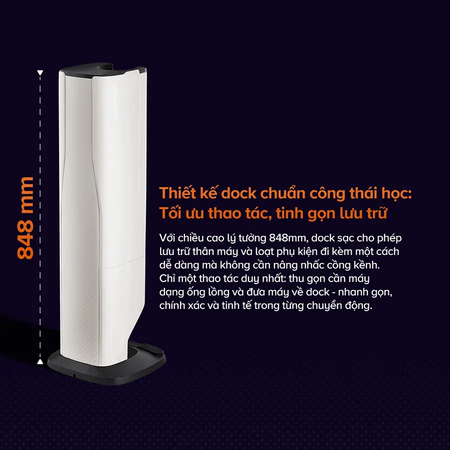 Roborock H60 Hub Pro gây ấn tượng với lực hút mạnh mẽ 170AW, mang lại hiệu quả làm sạch vượt trội trên nhiều loại bề mặt khác nhau trong nhà. Máy được trang bị đầu hút chống rối dành cho sàn và thảm, kết hợp đèn chiếu ánh sáng xanh với góc chiếu rộng 140° giúp phát hiện dễ dàng cả những hạt bụi nhỏ khó nhìn thấy. Thiết bị đi kèm nhiều đầu hút tiện dụng, hỗ trợ làm sạch linh hoạt ở nhiều vị trí khác nhau. Ngoài ra, hệ thống lọc 5 lớp tiên tiến giúp giữ lại đến 99,95% bụi mịn, trong khi dock sạc tích hợp chức năng tự động đổ bụi giúp việc dọn dẹp trở nên tiện lợi và tối ưu hơn, góp phần duy trì không gian sống sạch sẽ, gọn gàng.