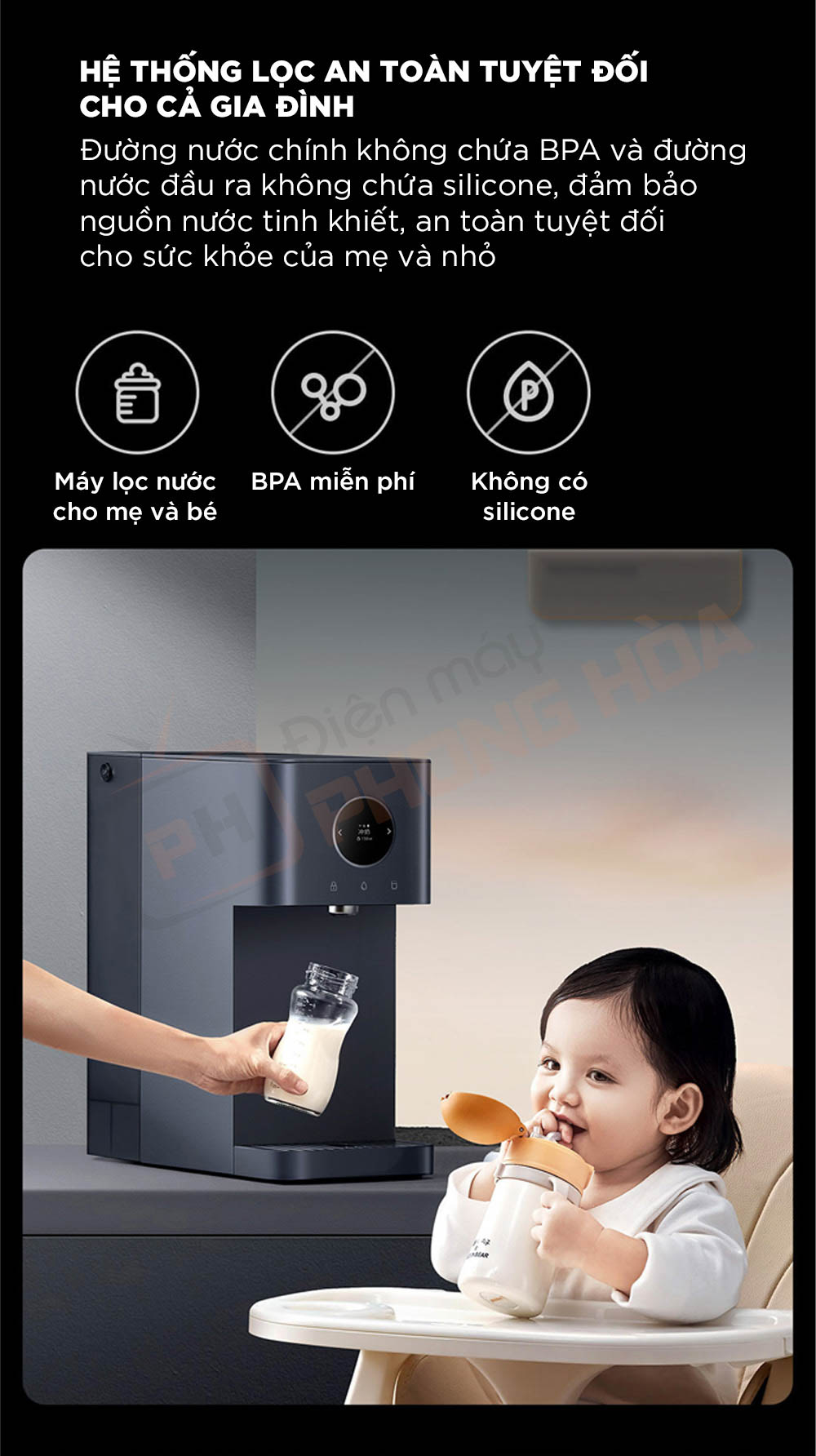 - Chất lượng nước tinh khiết cao, đạt chuẩn an toàn cho mẹ và bé, có thể uống trực tiếp mà không cần đun sôi.