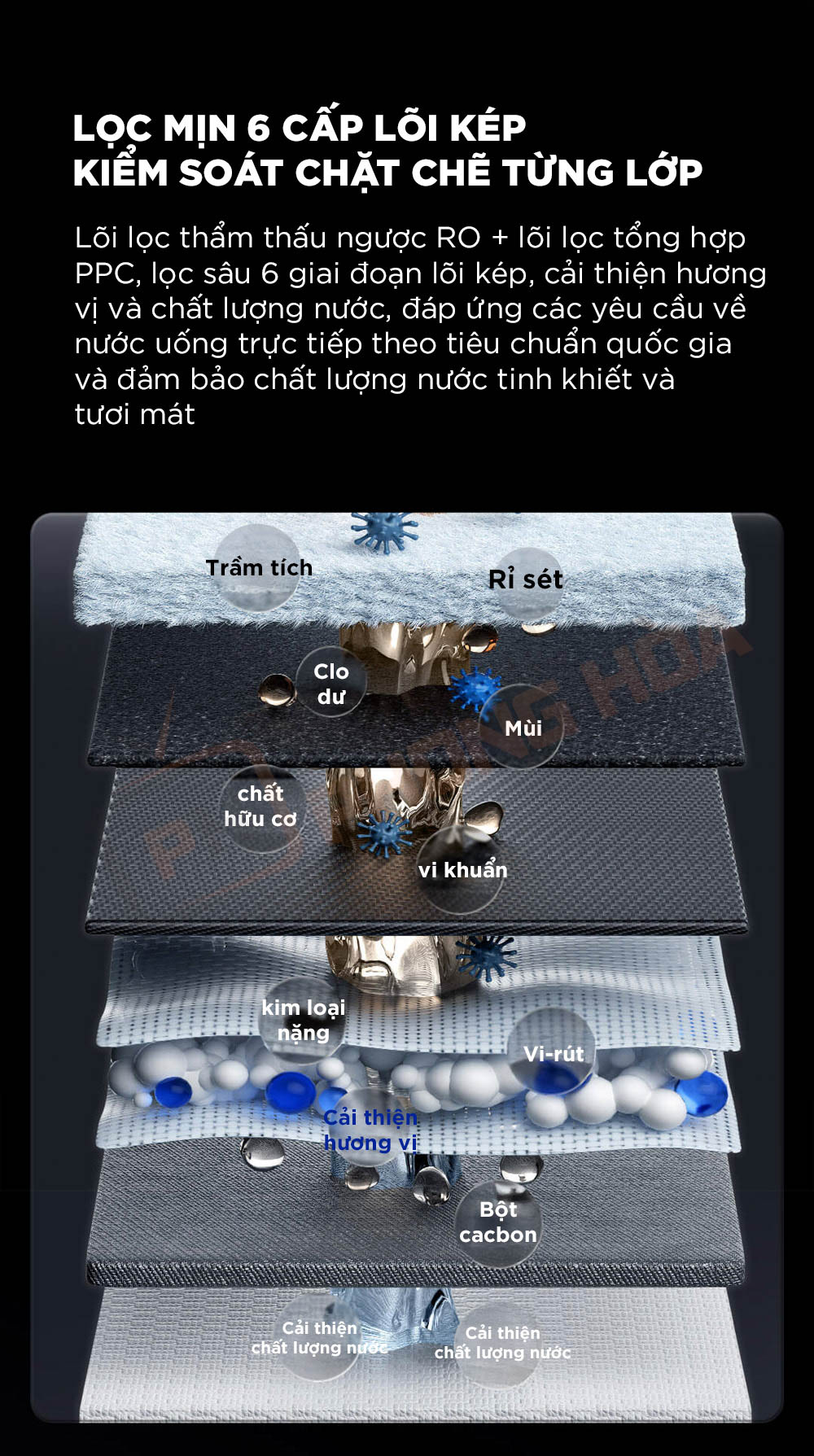- Hệ thống lọc mịn sáu cấp lõi kép, loại bỏ hoàn toàn vi khuẩn, kim loại nặng và các chất độc hại khác.