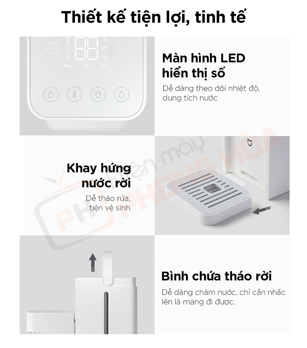 - Bình chứa tháo rời tiện châm nước và mang theo khi cần.