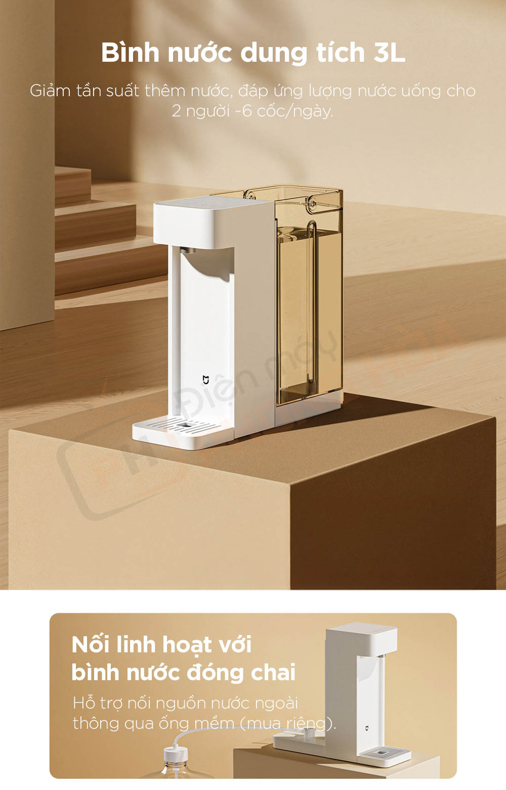 - Bình chứa 3 lít đủ cho 2 người dùng cả ngày mà không cần châm nước nhiều lần.