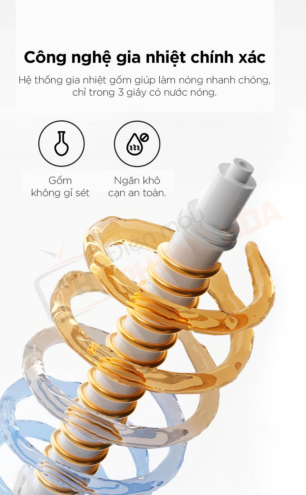 - Gia nhiệt bằng gốm, làm nóng nước chỉ trong 3 giây, an toàn và không bị gỉ sét.