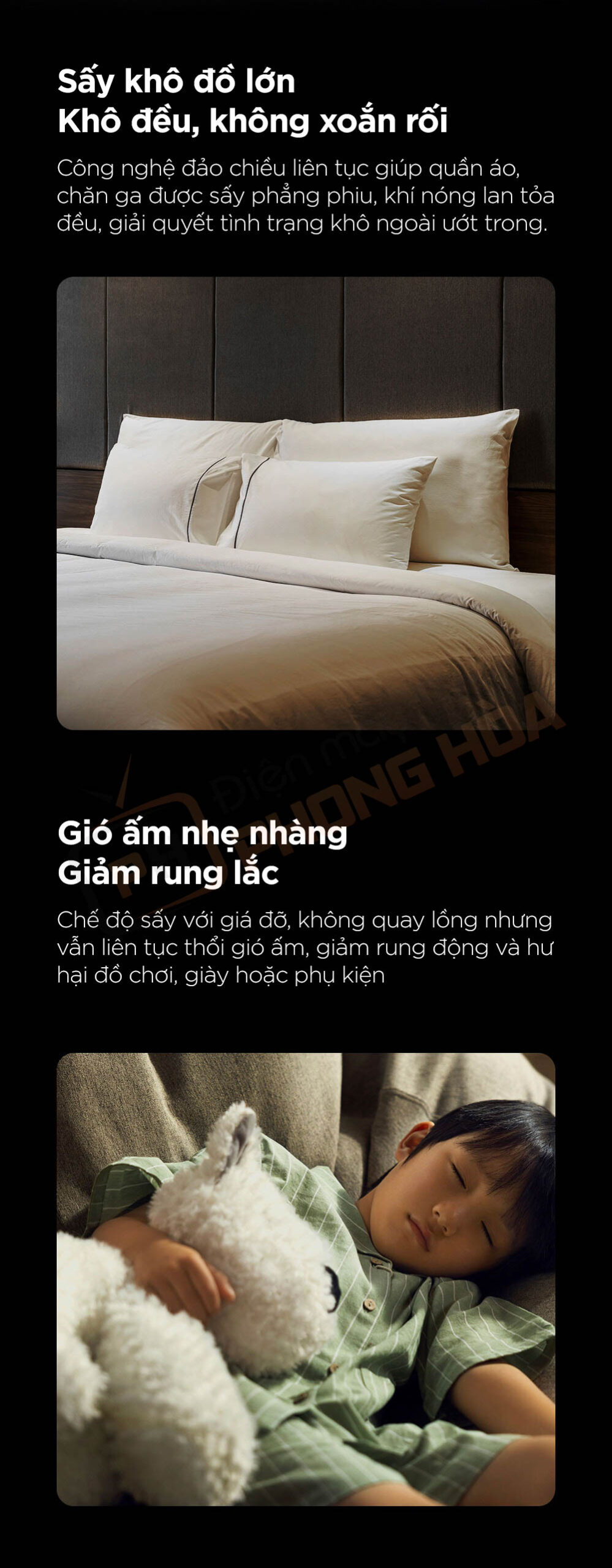 - Công nghệ sấy đảo chiều 1:1 – Chống xoắn rối, giúp quần áo khô đều, mềm mại hơn.