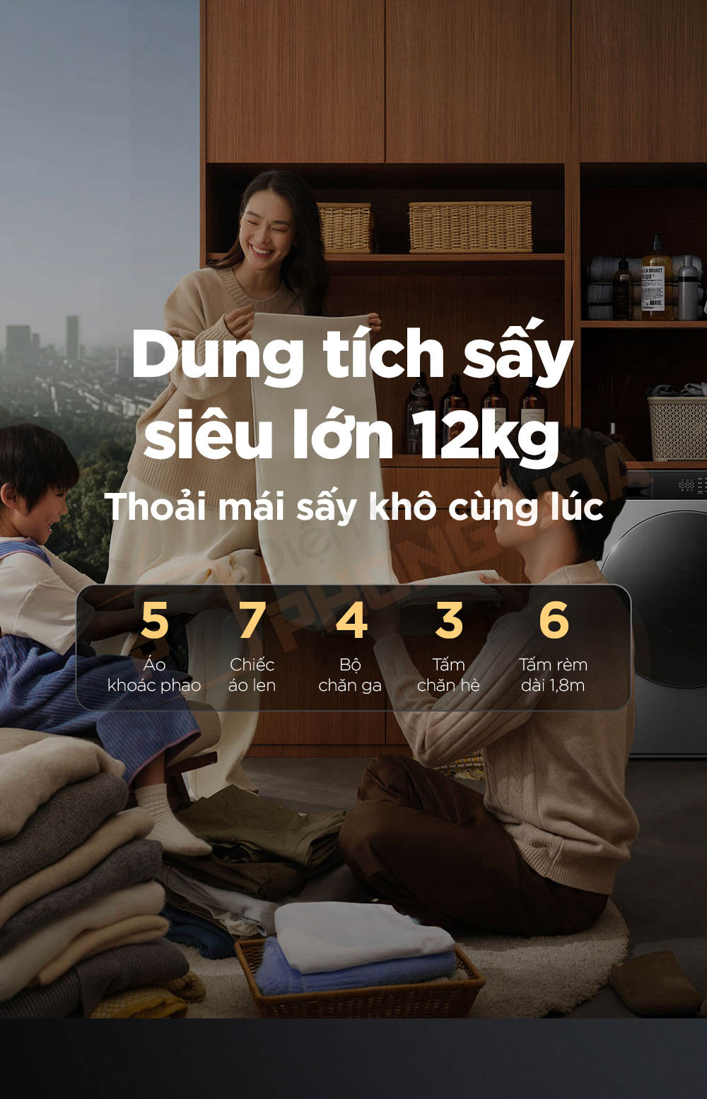 - Dung tích lớn 12kg – Sấy gọn toàn bộ quần áo cho cả gia đình chỉ trong một lần.