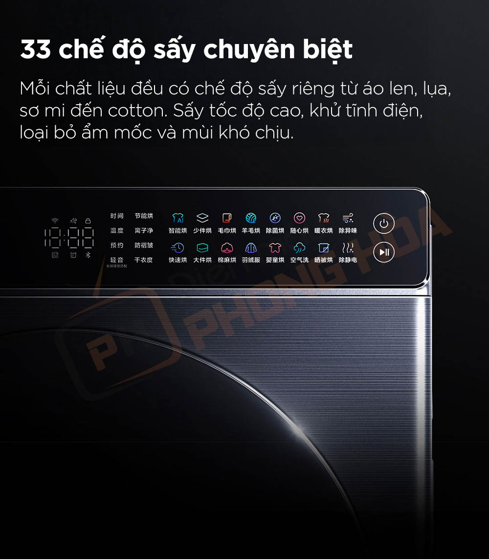 - 33 chế độ sấy chuyên biệt – Tùy chỉnh linh hoạt theo từng chất liệu vải, từ cotton đến lụa.