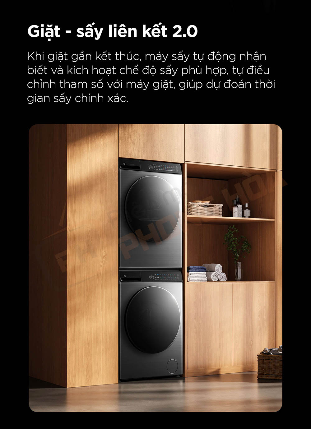 - Giặt & sấy liên kết 2.0 – Kết nối trực tiếp với máy giặt Xiaomi, tối ưu thời gian và tiết kiệm năng lượng.