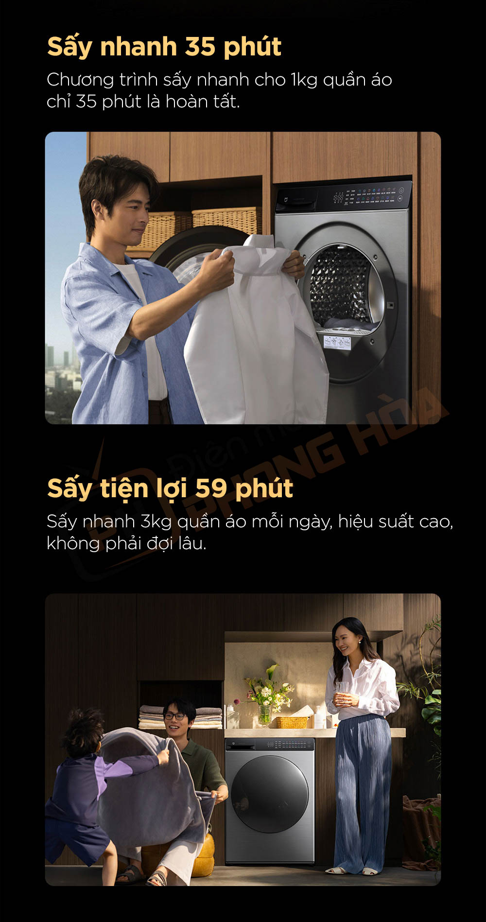 - Chế độ sấy nhanh 35 phút – Làm khô 1kg quần áo, sẵn sàng mặc ngay sau khi sấy.