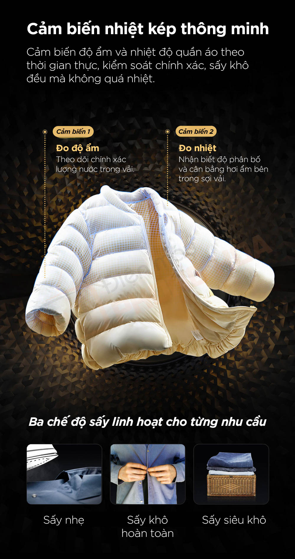- Cảm biến nhiệt – ẩm kép thông minh – Tự động ngắt khi quần áo vừa khô, bảo vệ sợi vải và tiết kiệm điện.
