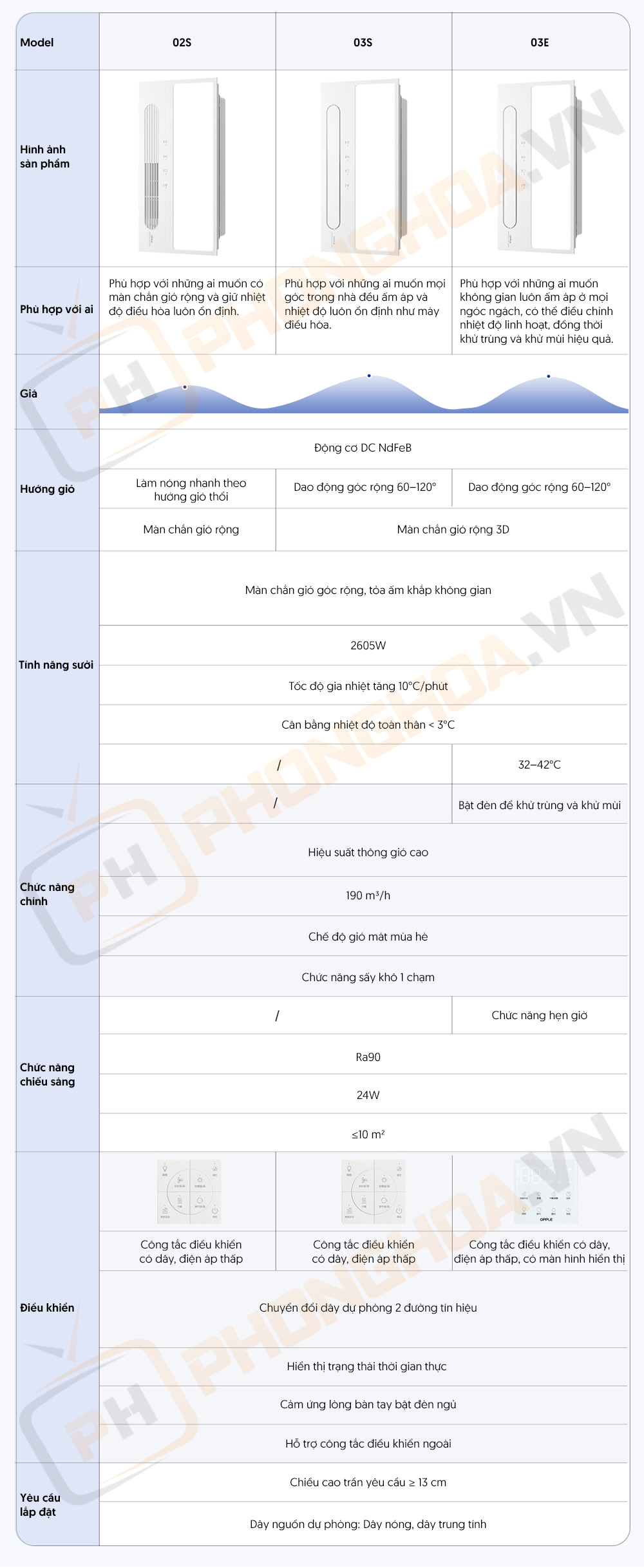 Bảng so sánh các dòng sản phẩm Máy sưởi phòng tắm OPPLE 02S/03S/03E