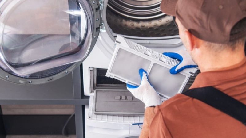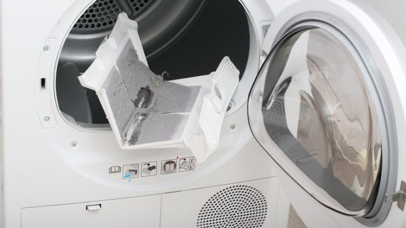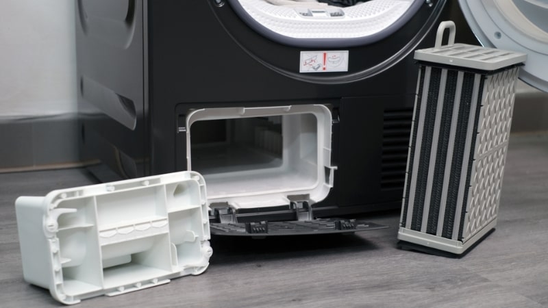 Ngăn lọc xơ vải nếu bị bít tắc sẽ khiến luồng khí nóng lưu thông kém, dẫn đến quần áo không khô đều. Bạn nên tháo bộ lọc ra, rửa sạch bằng nước ấm, dùng bàn chải mềm để loại bỏ bụi bẩn rồi lau khô trước khi lắp lại.