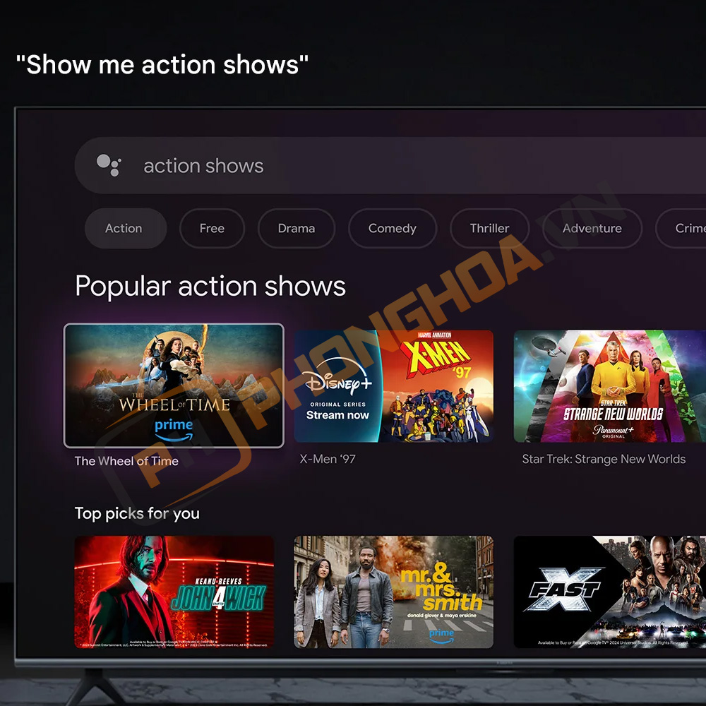 Hệ điều hành Google TV thông minh: Giao diện mượt mà, kho ứng dụng phong phú, hỗ trợ YouTube, Netflix, FPT Play và điều khiển giọng nói.