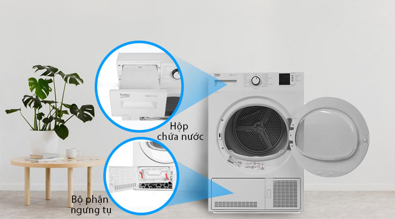 Máy sấy ngưng tụ (Condenser Dryer) hoạt động bằng cách làm nóng không khí bằng thanh điện trở, tương tự máy sấy thông hơi. Tuy nhiên, thay vì xả khí nóng ẩm ra ngoài, hơi nước trong quá trình sấy sẽ được làm lạnh và ngưng tụ thành nước, sau đó chảy vào khay chứa hoặc thoát ra ngoài qua đường xả nước. Nhờ cơ chế này, máy sấy ngưng tụ không cần lắp ống thoát khí.