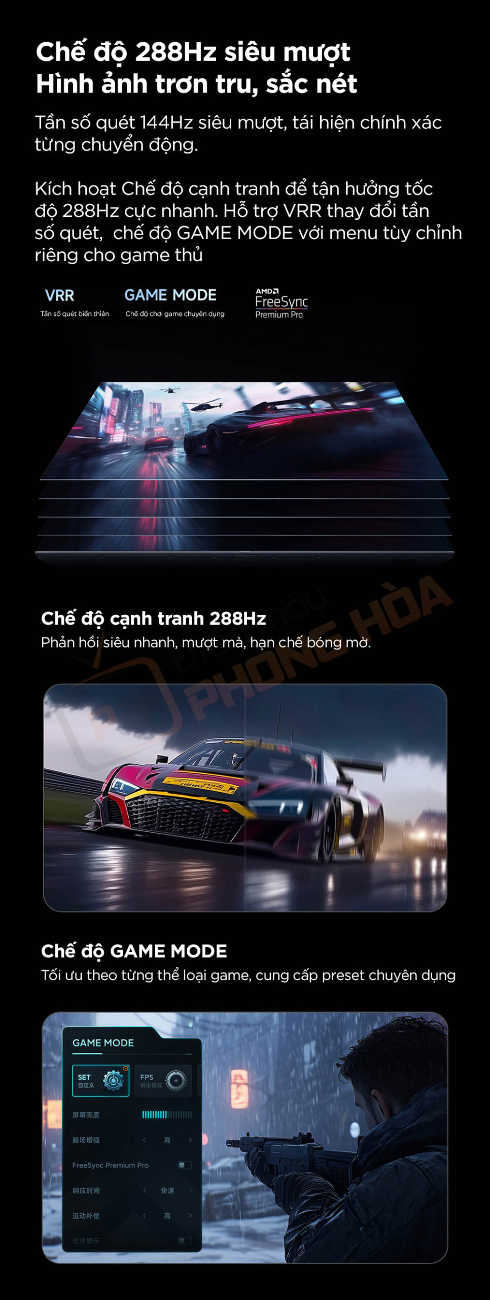 - Tần số quét siêu cao 288Hz, hỗ trợ 4K 144Hz mượt mà.