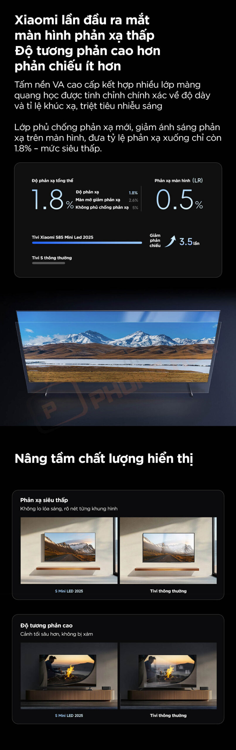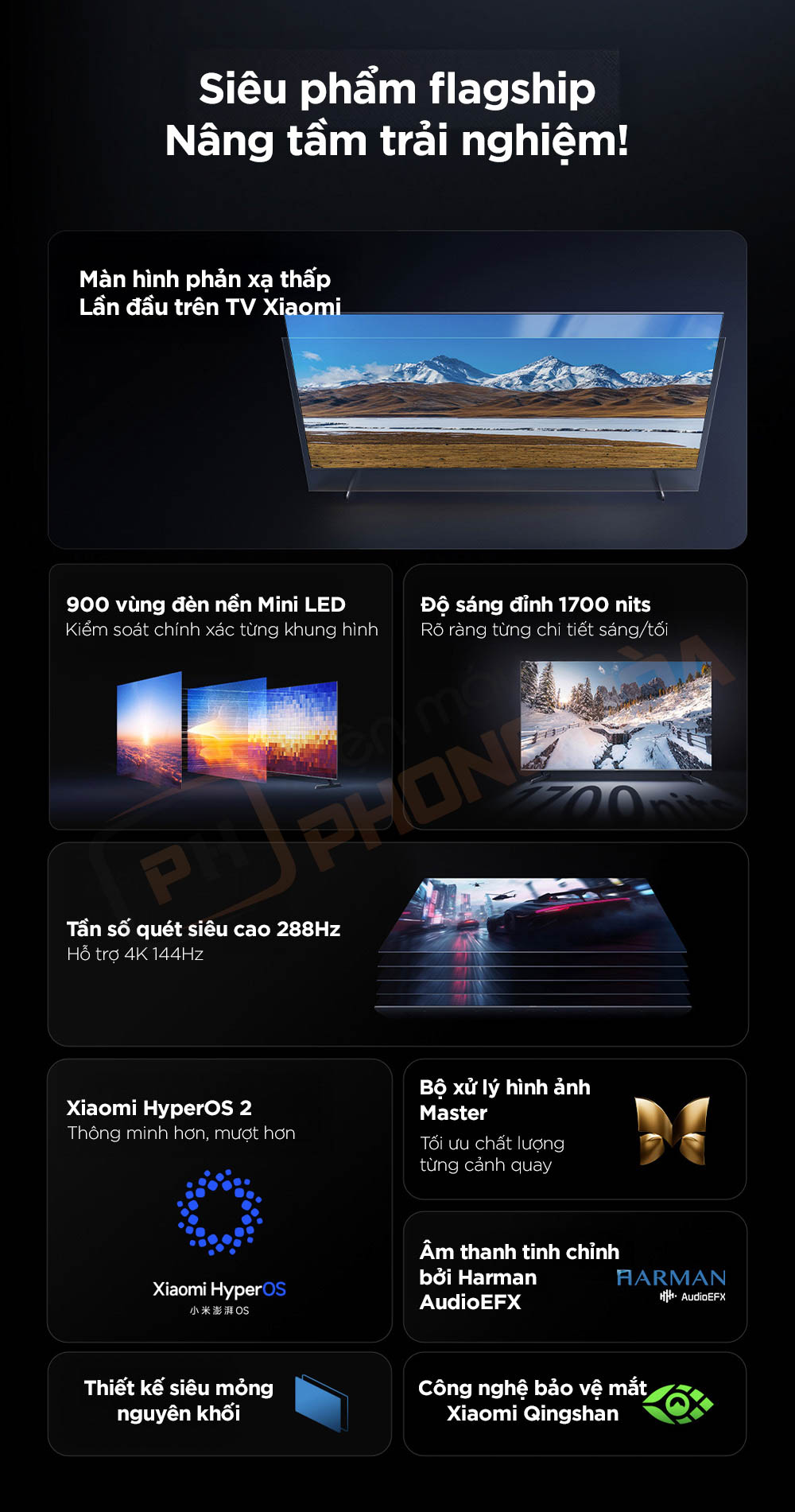 Tivi Xiaomi S85 Mini Led 2025 – màn hình Mini LED siêu sáng, tần số quét 288Hz và âm thanh Harman sống động, kết hợp bảo vệ mắt Xiaomi QingShan, đem đến trải nghiệm giải trí đỉnh cao ngay tại nhà.