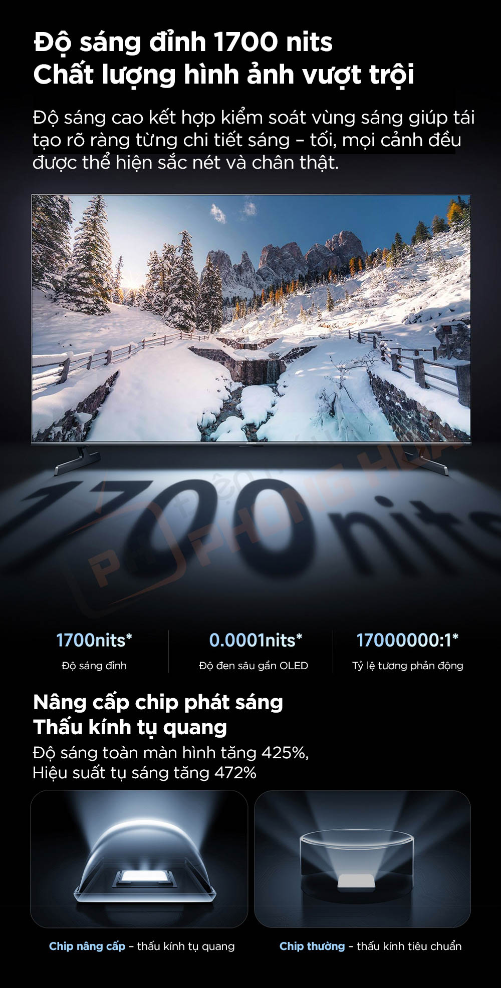 - Độ sáng đỉnh 1700 nits, hiển thị rõ nét cả cảnh tối lẫn cảnh sáng.