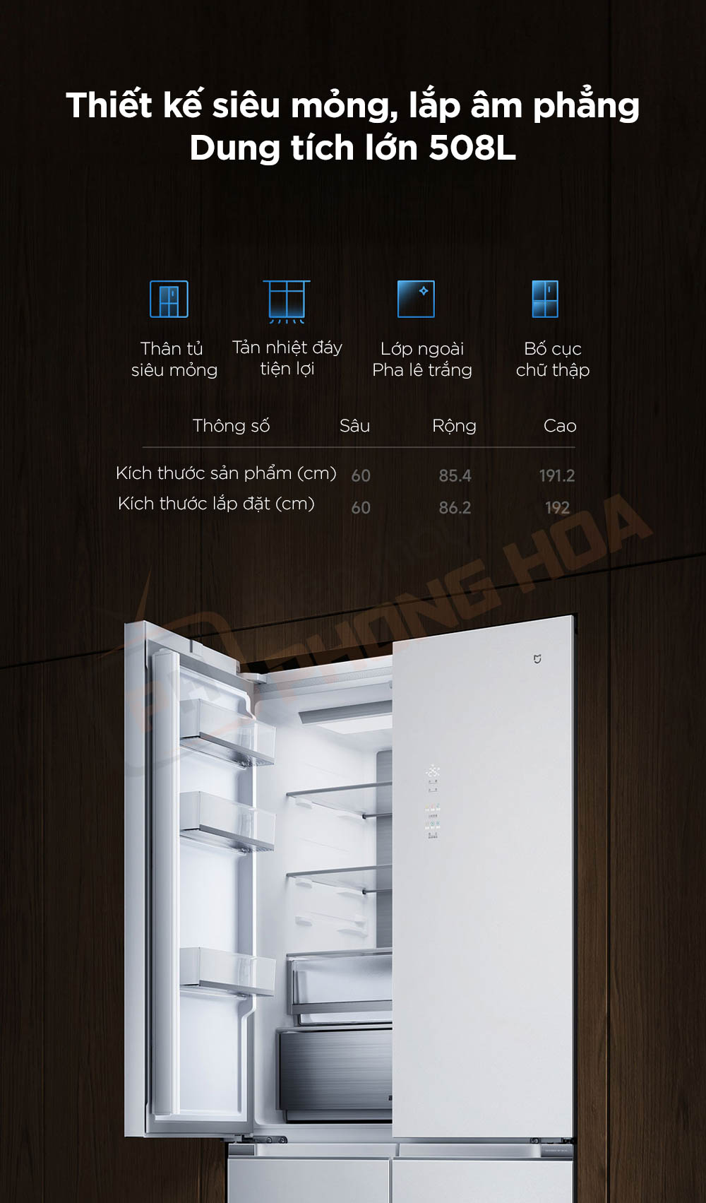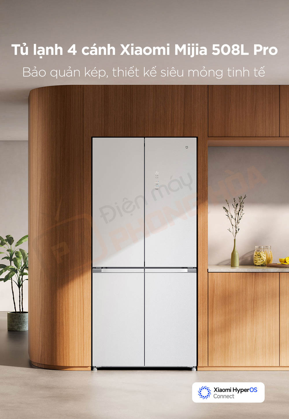 Tủ lạnh 4 cánh Xiaomi Mijia 508L Pro ghi điểm với hệ thống làm lạnh kép không lẫn mùi, thiết kế chữ thập siêu mỏng tinh tế và dung tích lớn, mang đến giải pháp bảo quản thực phẩm cao cấp cho gia đình hiện đại.