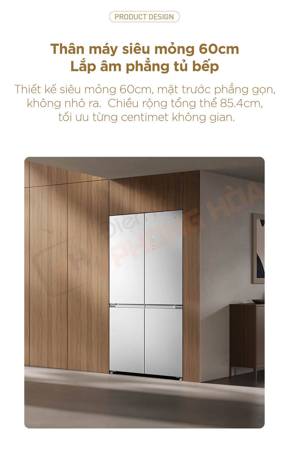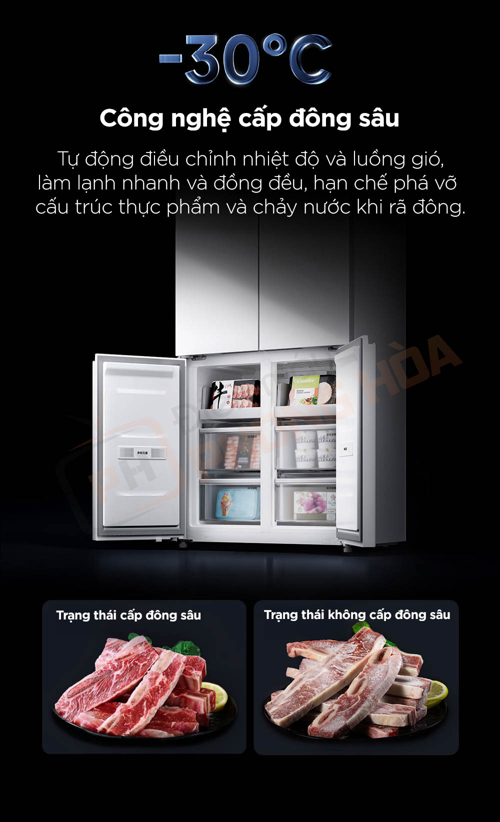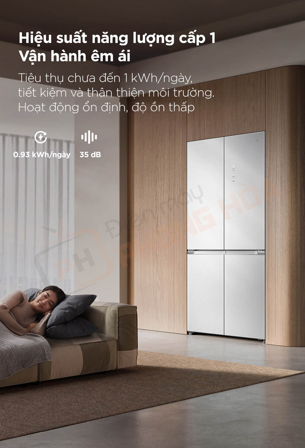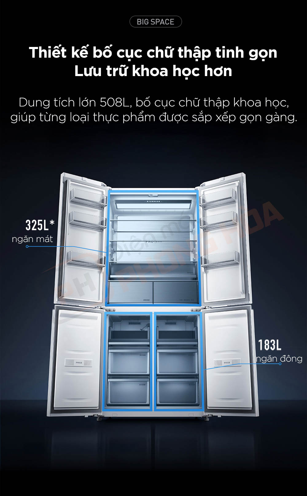 - Dung tích lớn 508L, thiết kế chữ thập khoa học, phân khu rõ ràng, dễ sắp xếp và lấy thực phẩm.