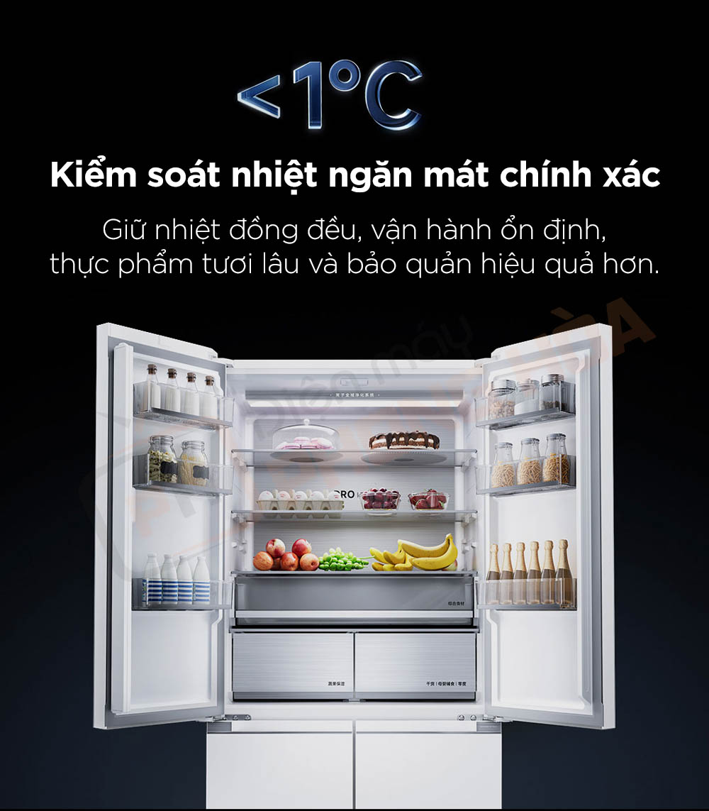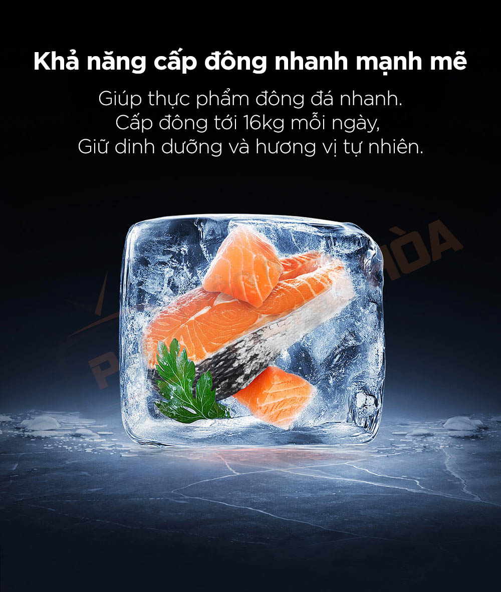 - Ngăn mát kiểm soát nhiệt độ chính xác dưới ±1°C, giữ thực phẩm tươi lâu hơn. Ngăn đông làm lạnh sâu đến -30°C, khả năng cấp đông nhanh 16kg/ngày