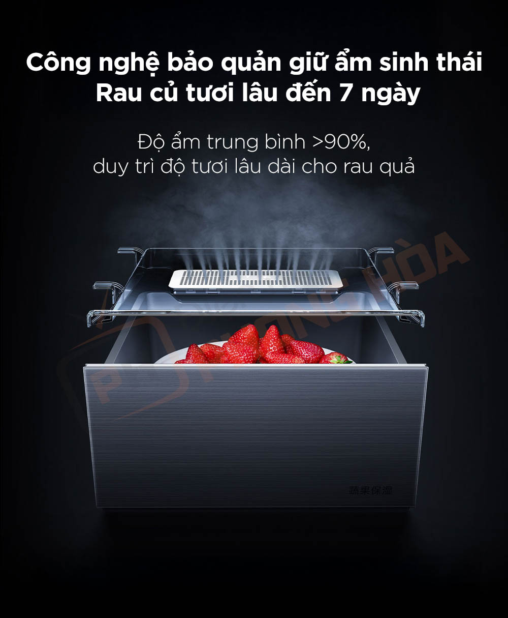 - Công nghệ bảo quản giữ ẩm sinh thái duy trì độ ẩm ngăn mát >90%, rau củ tươi đến 7 ngày.