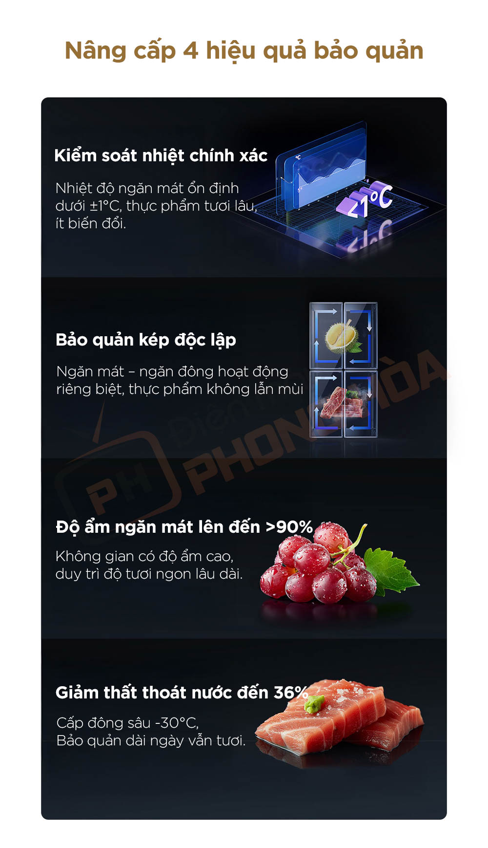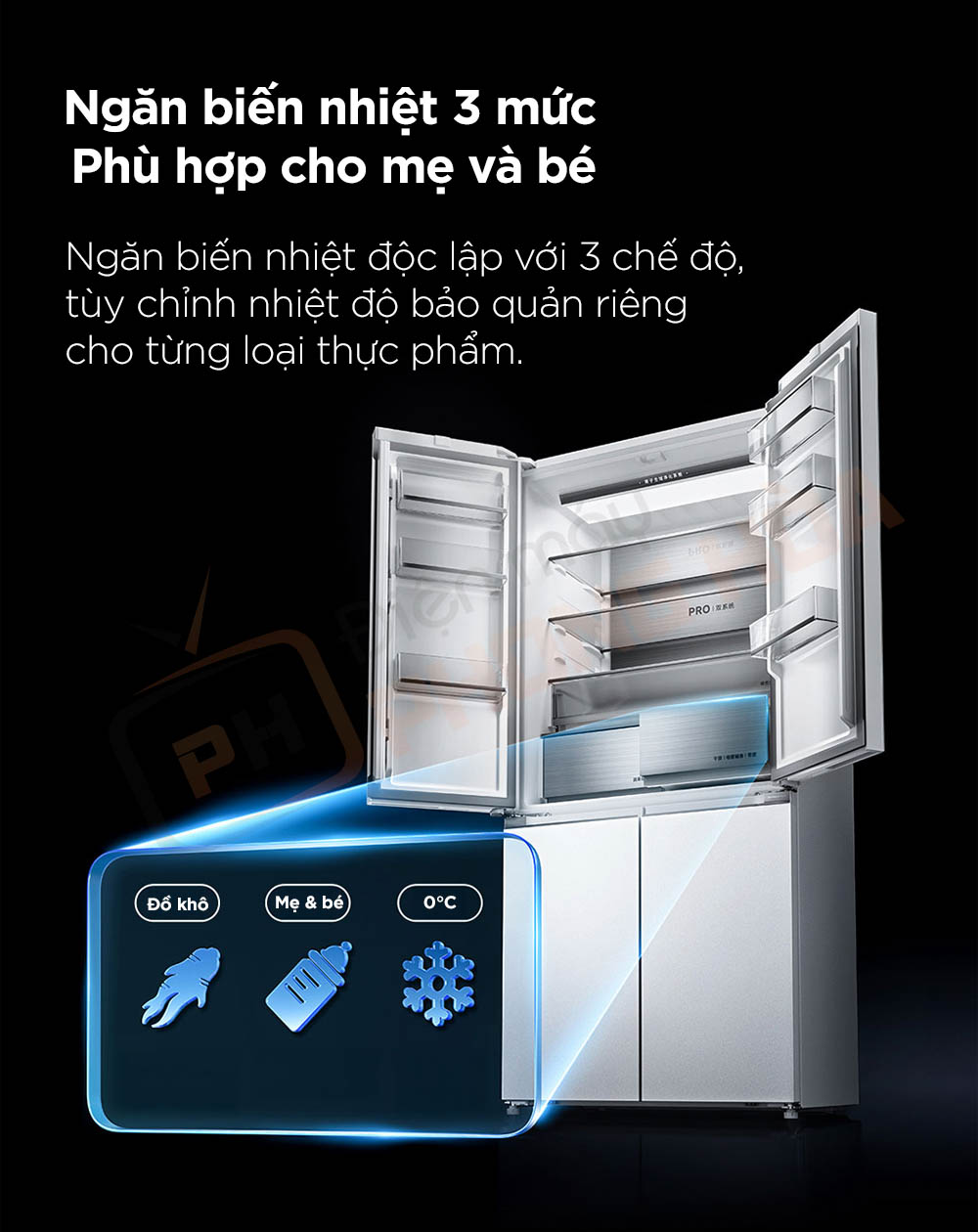 - Không gian biến nhiệt 3 mức, tùy chỉnh linh hoạt theo từng loại thực phẩm, chế độ chuyên biệt cho đồ khô, mẹ & bé, và 0°C.