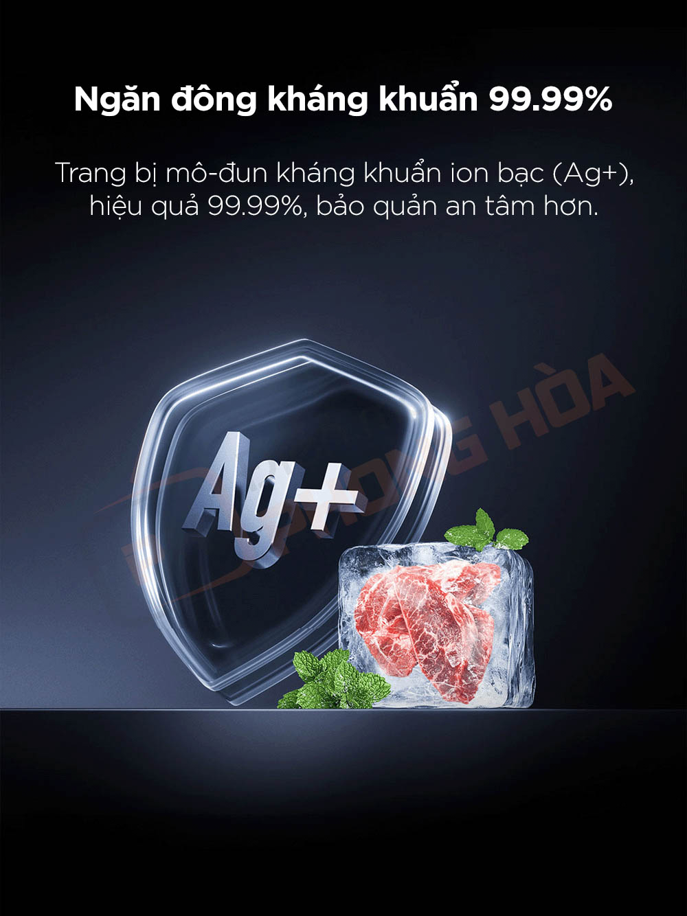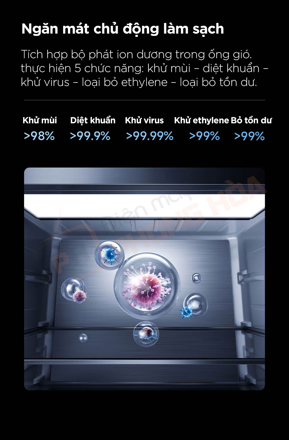 - Ngăn mát tích hợp ion dương, thực hiện đồng thời 5 chức năng làm sạch, hiệu quả tới 99%, ngăn đông trang bị mô-đun ion bạc Ag+, kháng khuẩn 99.99%.