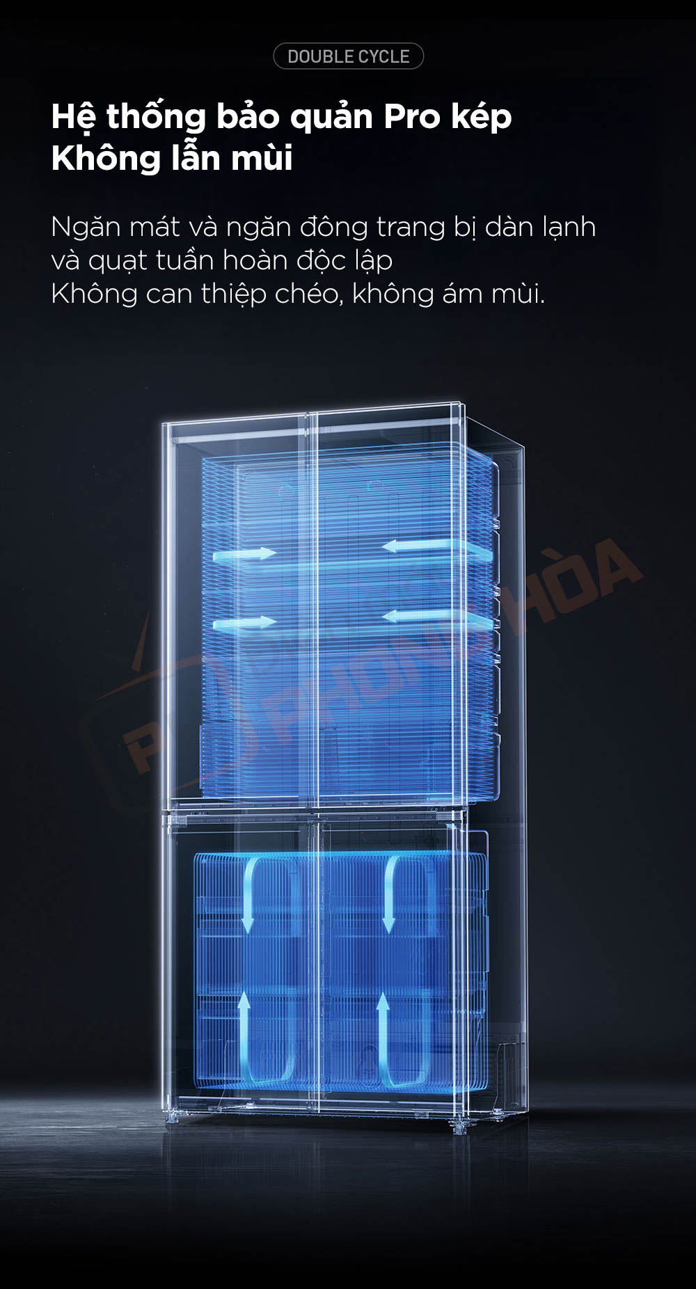 - Hệ thống bảo quản kép với dàn lạnh và quạt độc lập cho ngăn mát – ngăn đông, không lẫn mùi, không can thiệp chéo.